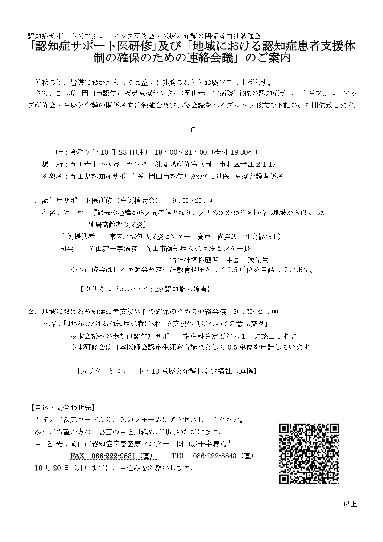 【ご案内】「認知症フォローアップ研修会・医療と介護の関係者向け勉強会」の開催について
