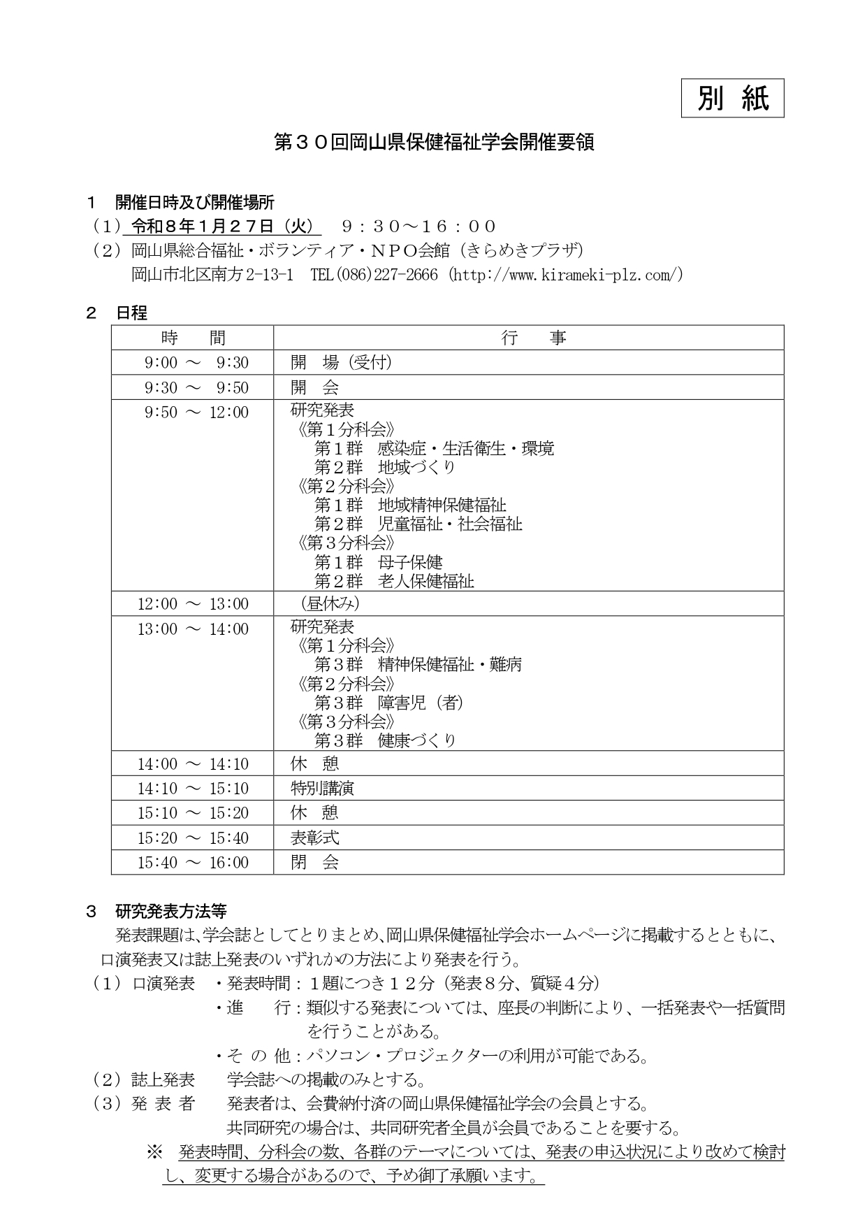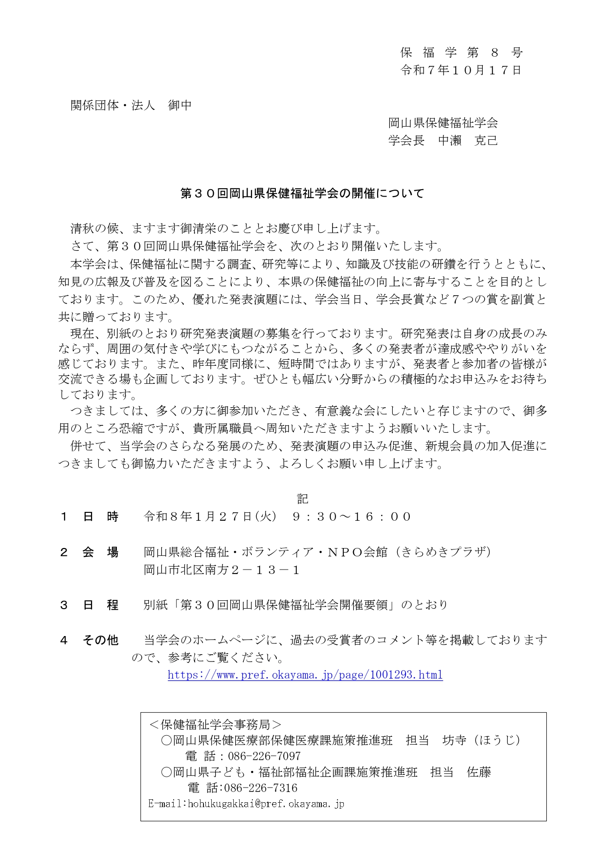 【ご案内】「第30回岡山県保健福祉学会」開催について