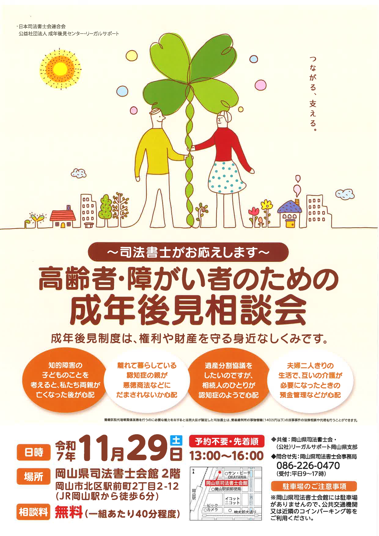 【ご案内】司法書士による「高齢者・障がい者のための成年後見相談会」(無料)開催について