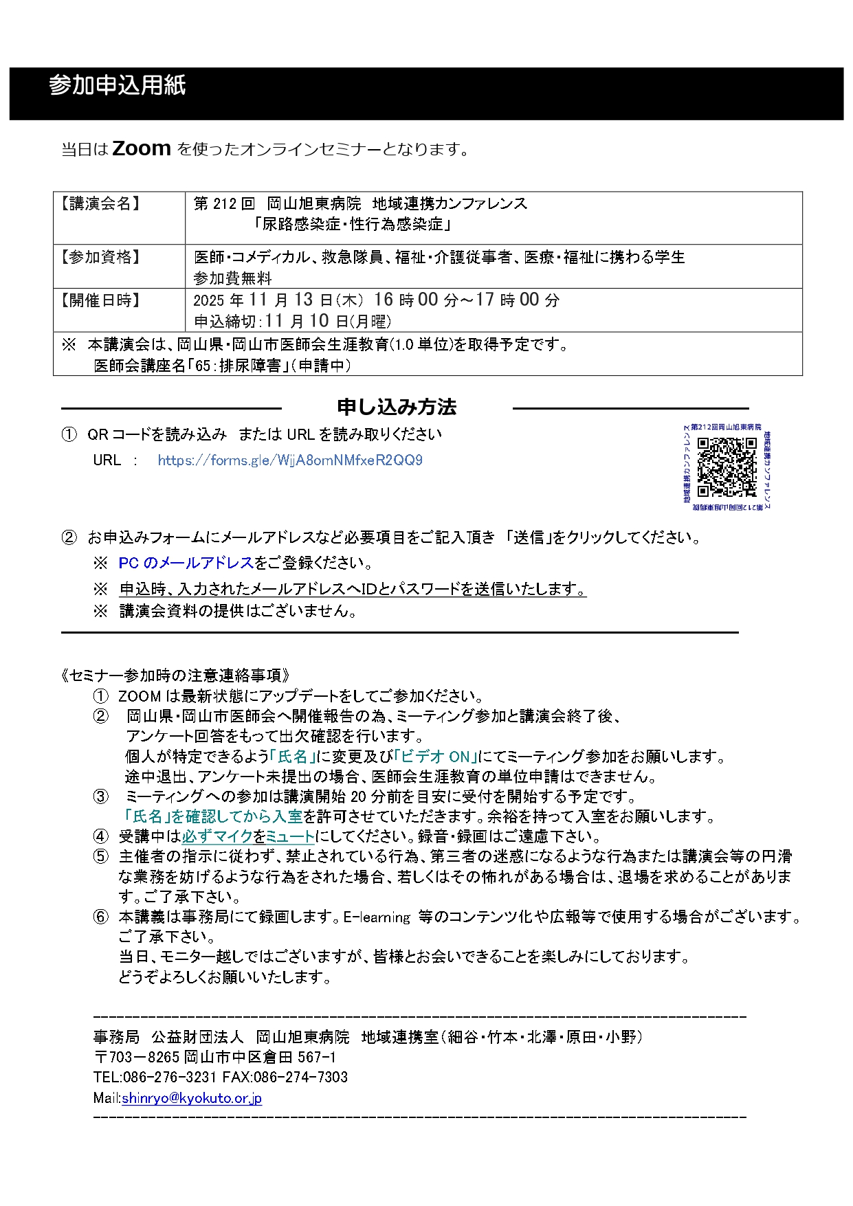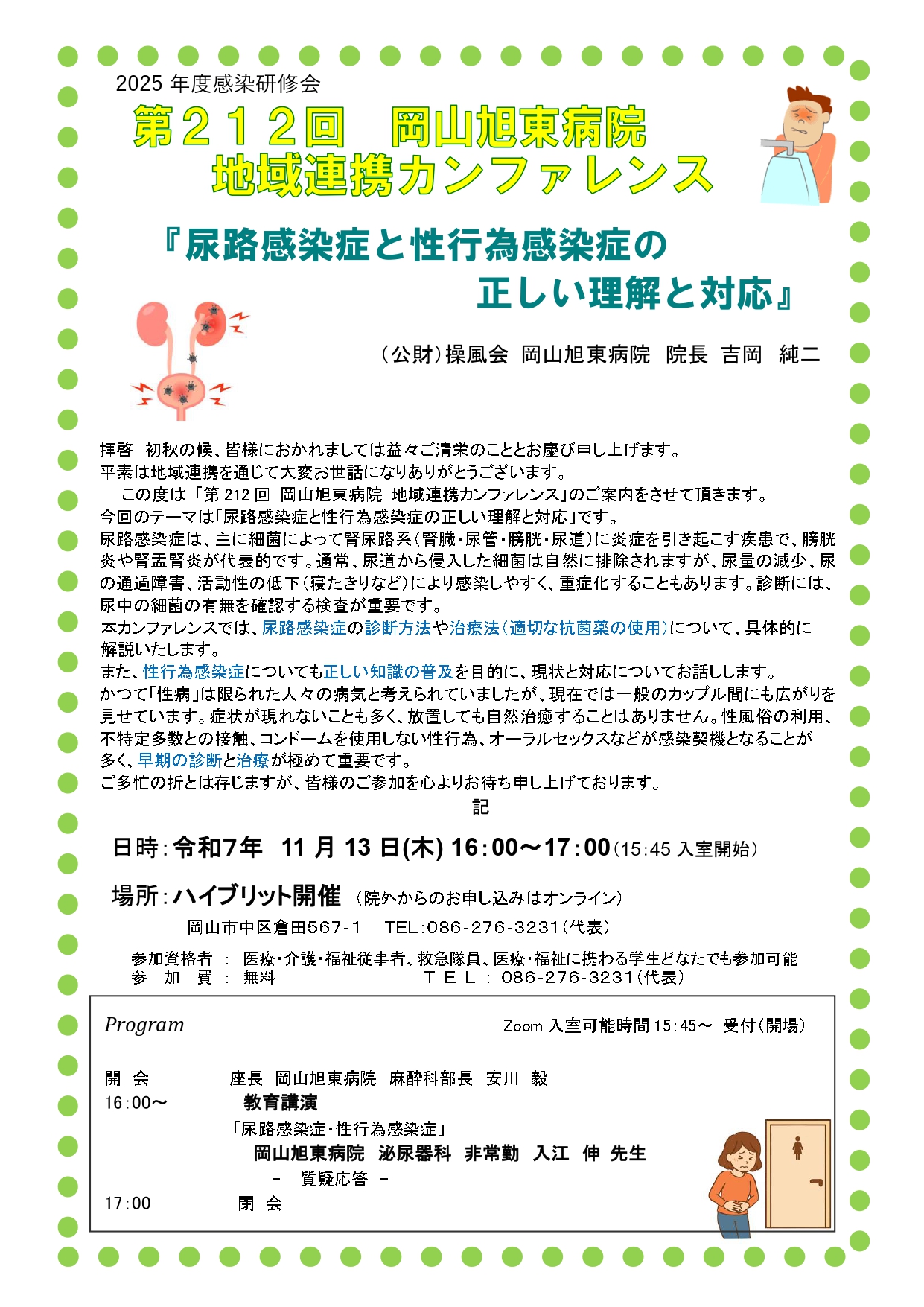 【お知らせ】第212回 岡山旭東病院 地域連携カンファレンス「尿路感染症と性行為感染症の正しい理解と対応」開催について