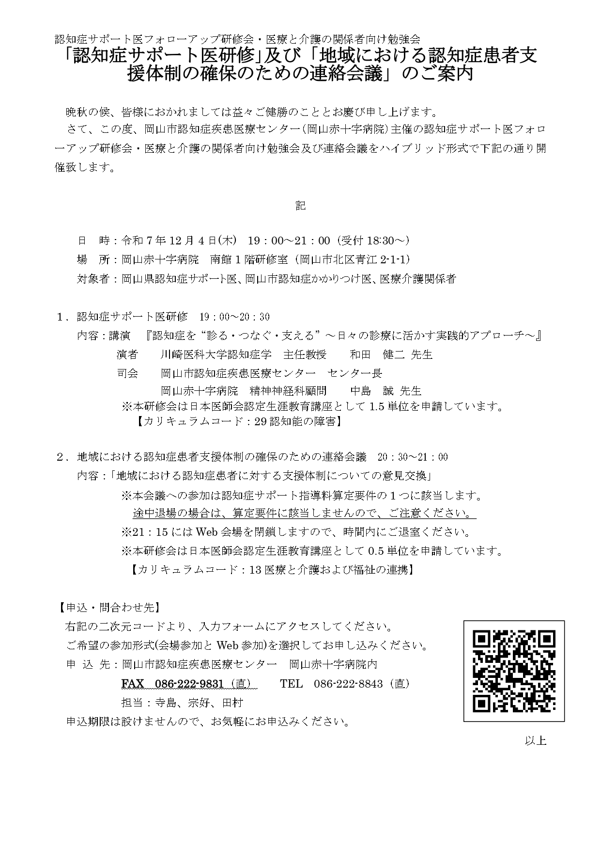 【お知らせ】「認知症サポート医研修」及び「地域における認知症患者支援体制の確保のための連絡会議」開催について