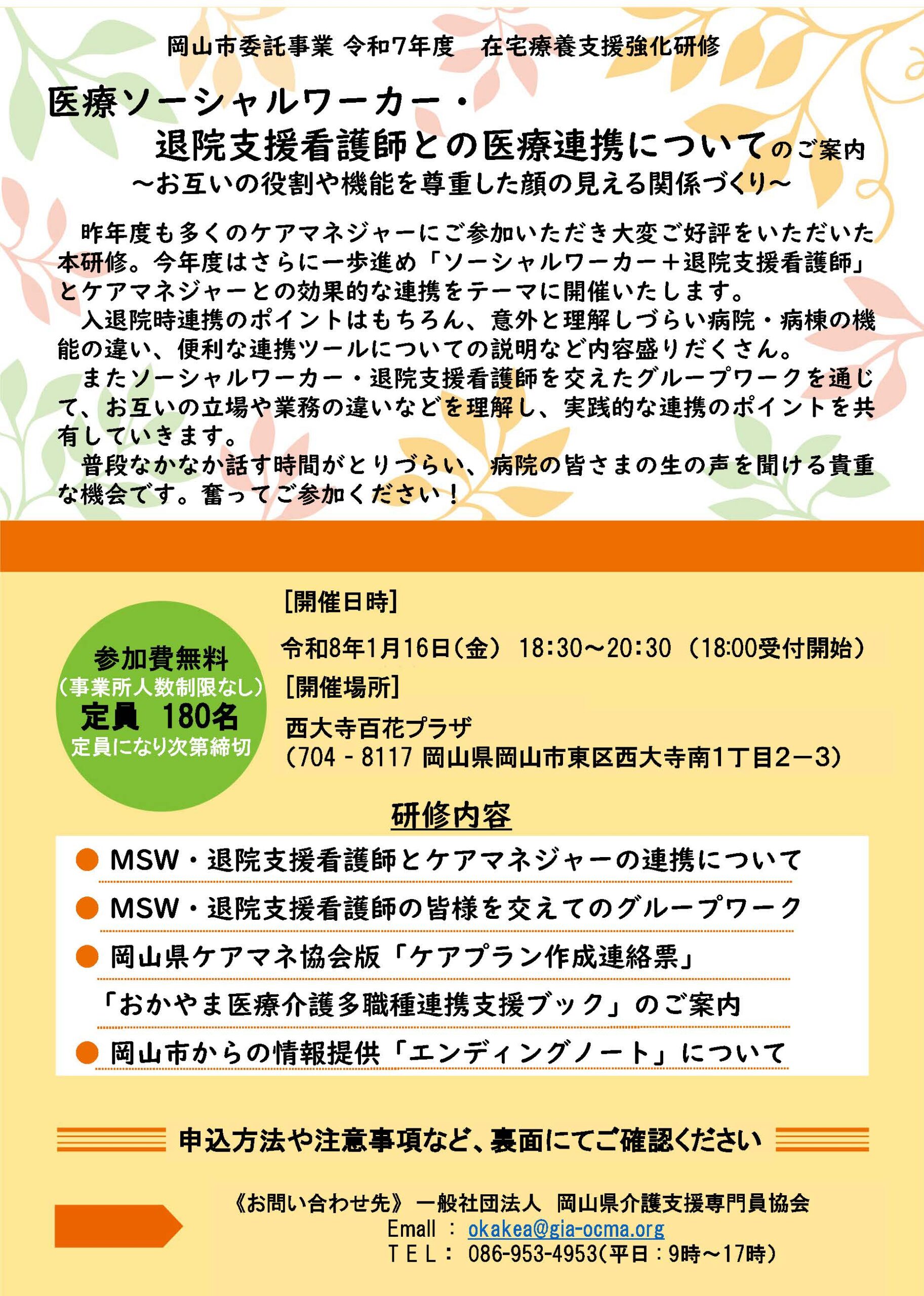岡山市では本年度も別紙案内文のとおり「令和7年度在宅療養支援強化研修事業」を実施することとなり、昨年度と同様、当協会が受託・実施させていただきます。