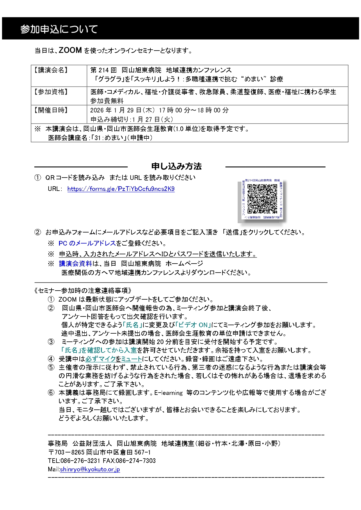 【お知らせ】第214回 岡山旭東病院 地域連携カンファレンス『「グラグラ」を「スッキリ」しよう!:多職種連携で挑む“めまい”診療』開催について