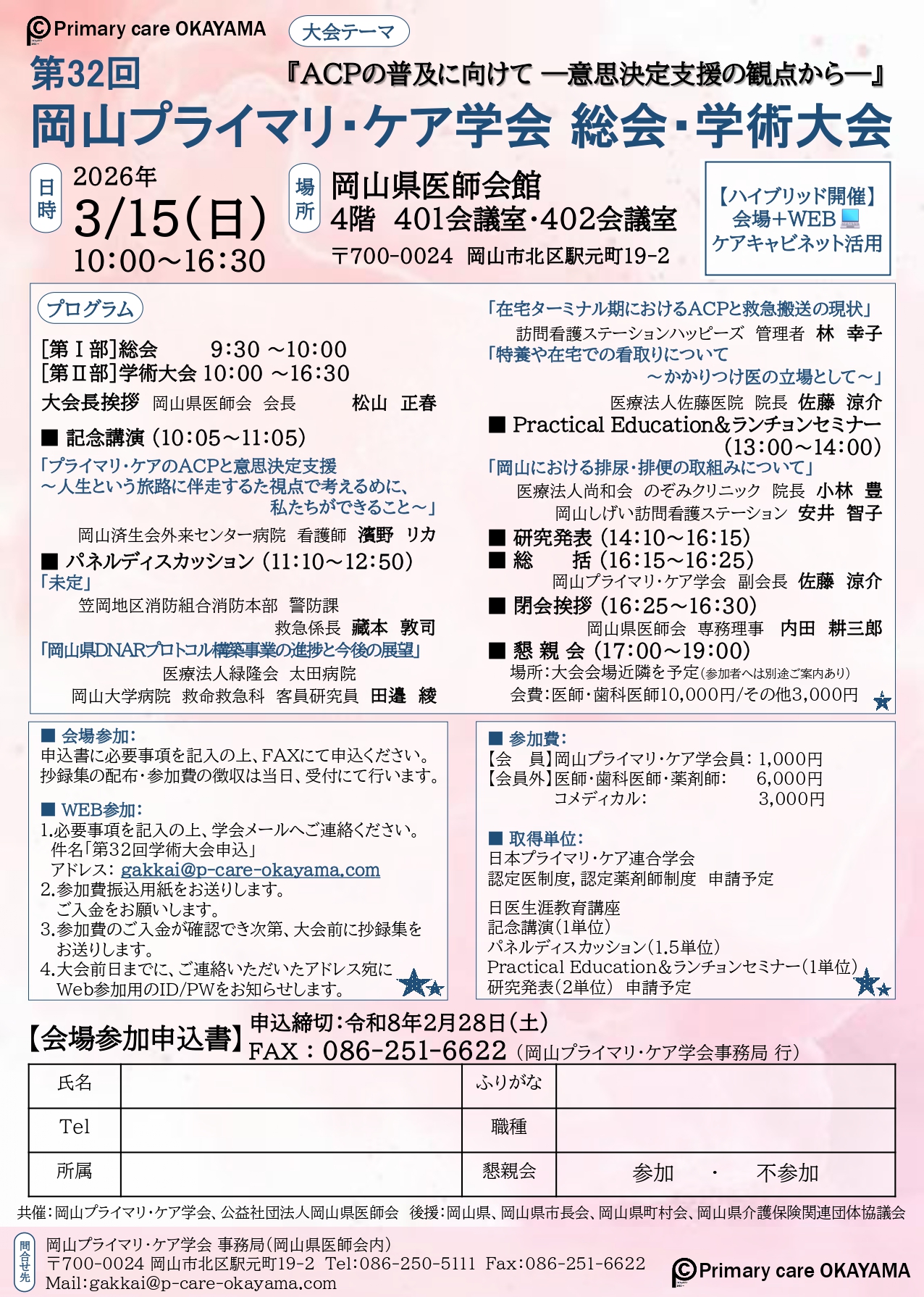 【お知らせ】「岡山プライマリ・ケア学会第32回学術大会」開催について