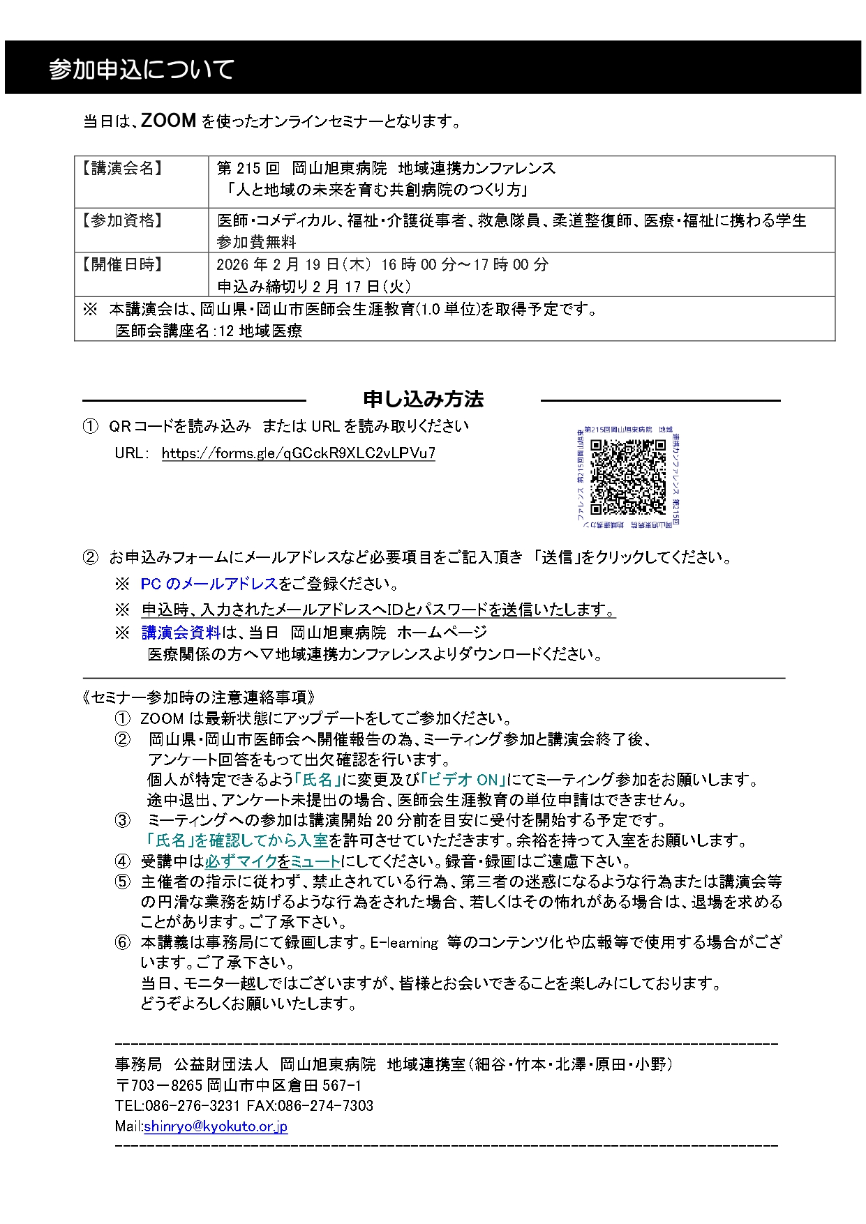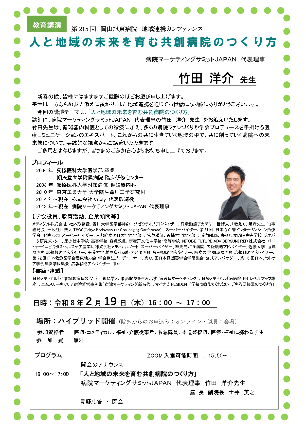 【お知らせ】第215回 岡山旭東病院 地域連携カンファレンス「人と地域の未来を育む共創病院のつくり方」開催について