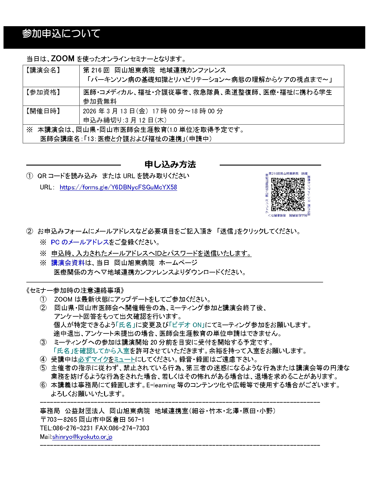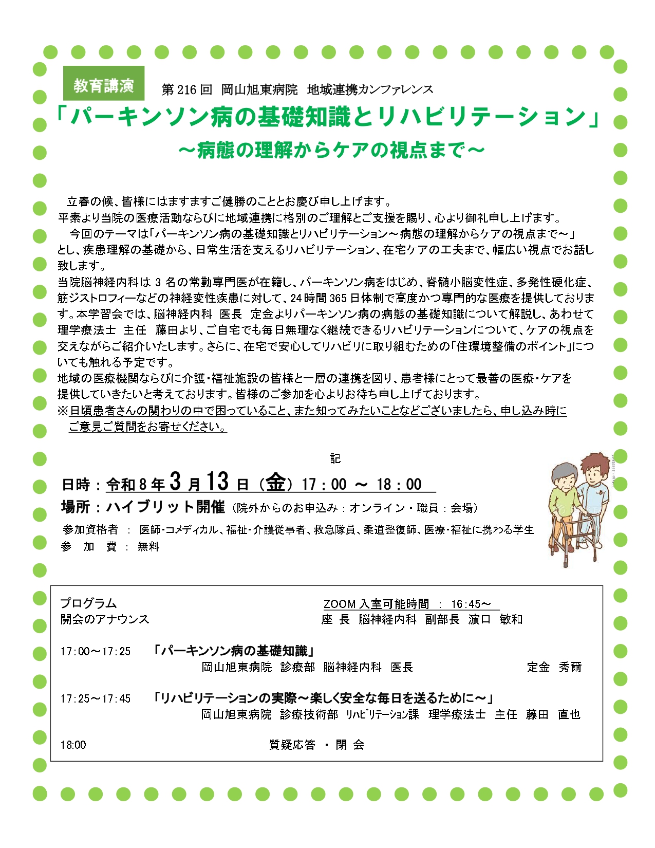 【お知らせ】第216回 岡山旭東病院 地域連携カンファレンス「パーキンソン病の基礎知識とリハビリテーション」開催について