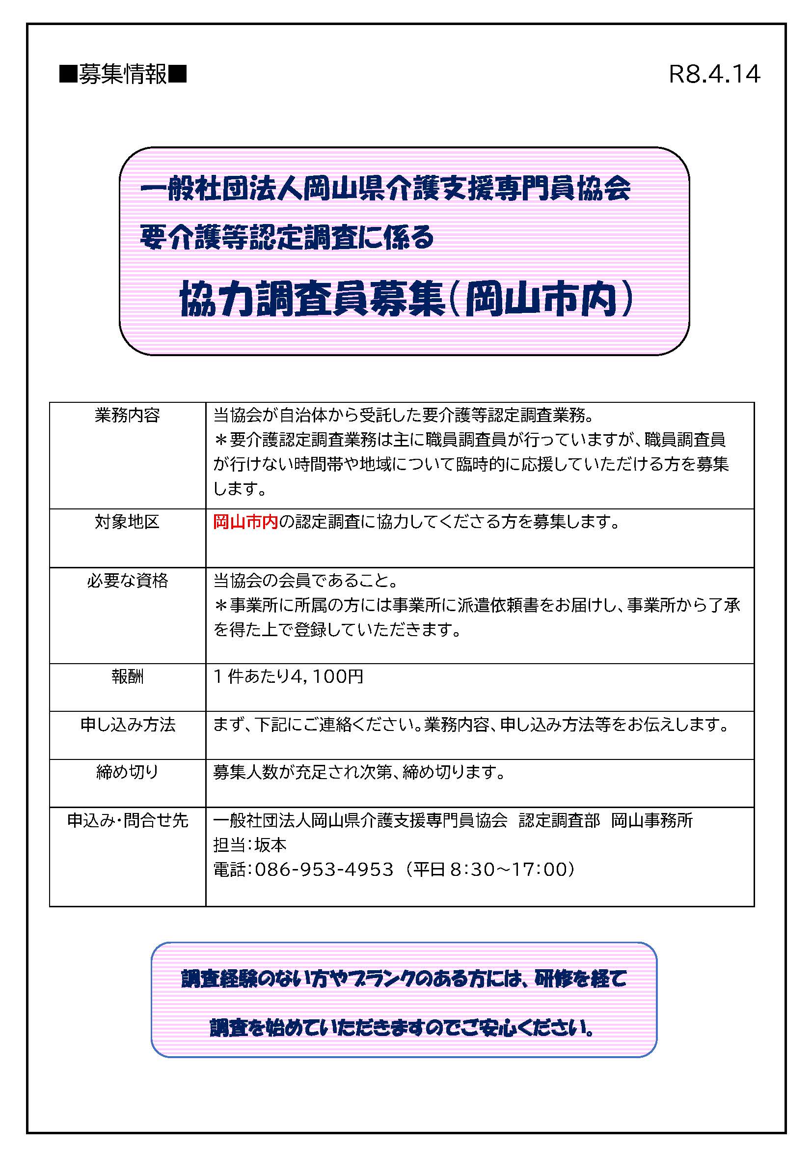 【お知らせ】要介護認定調査に係る協力調査員の募集(岡山市内)について