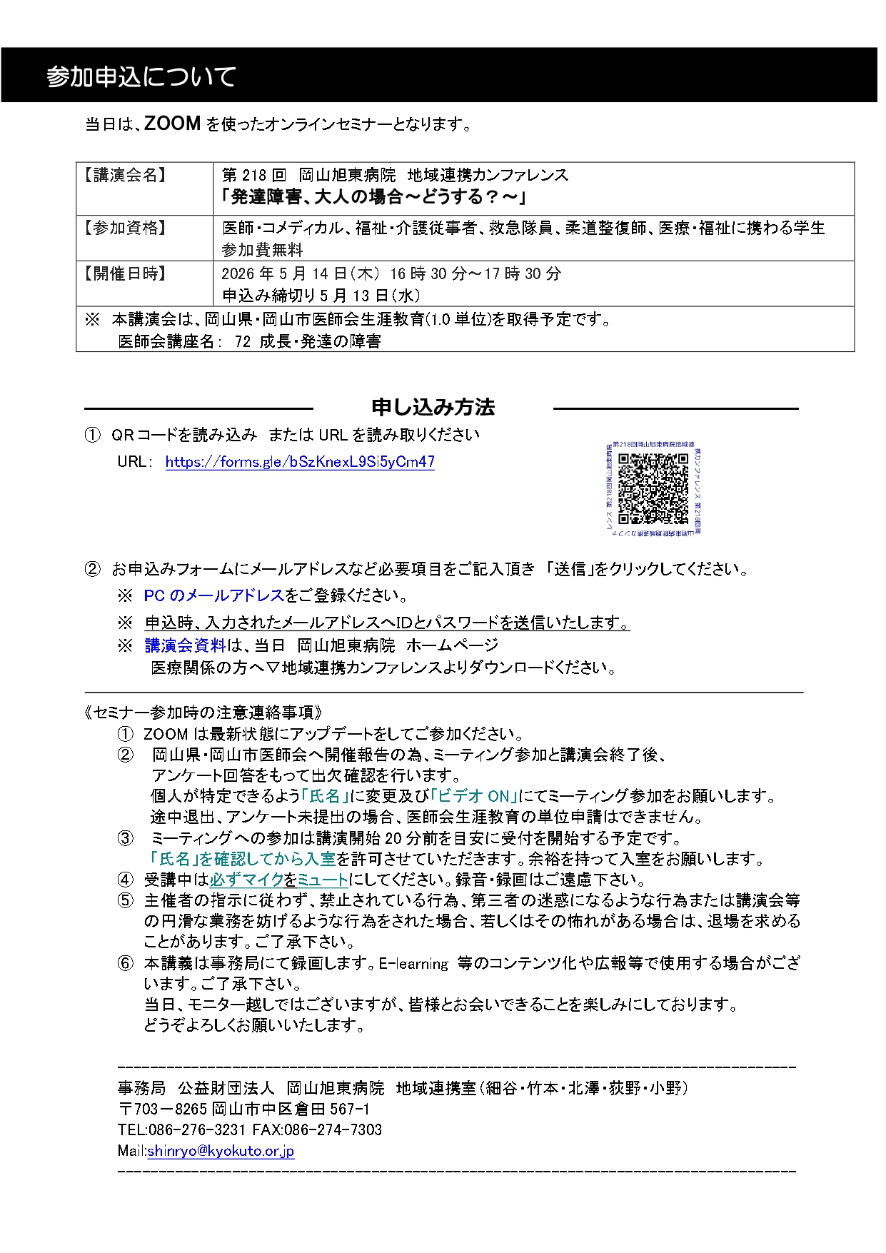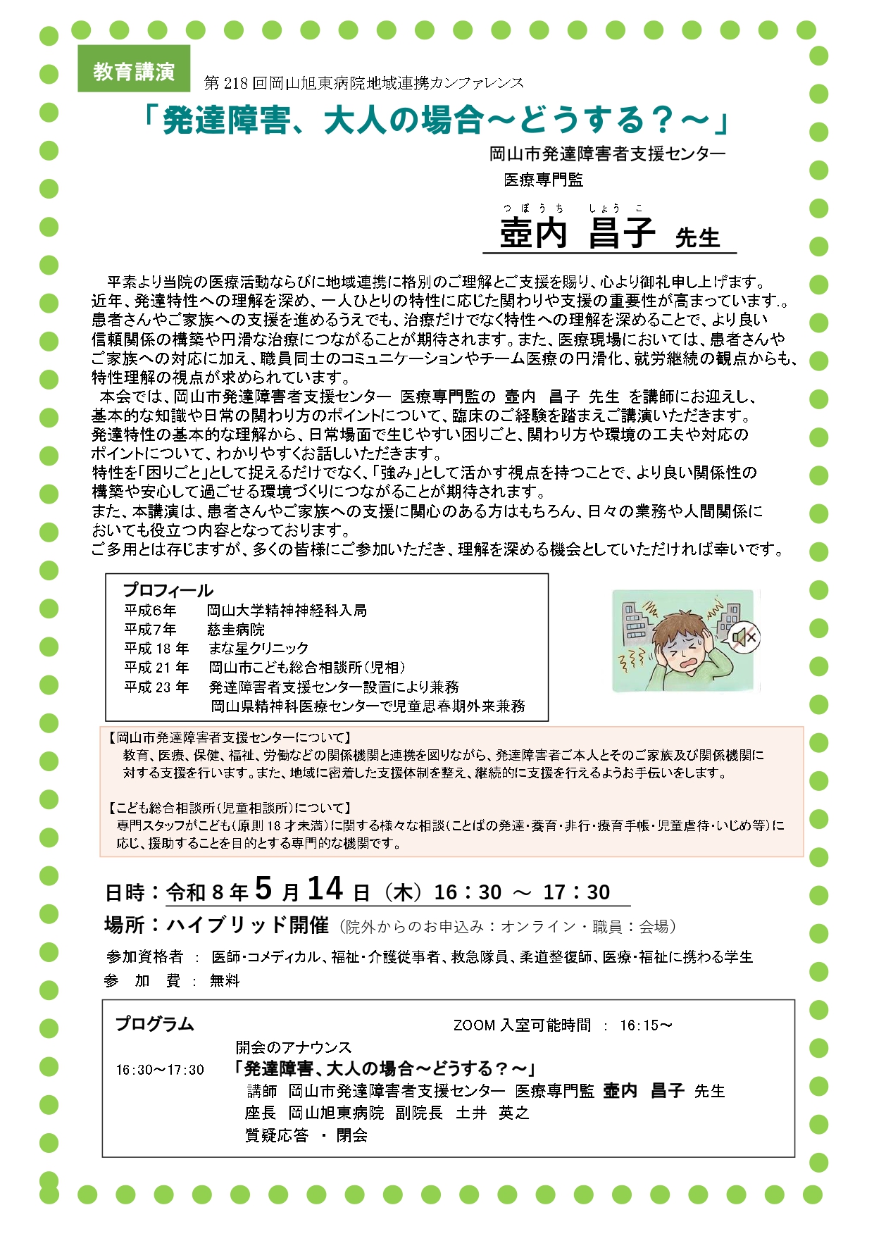 【お知らせ】第218回 岡山旭東病院 地域連携カンファレンス「発達障害、大人の場合~どうする?~」開催について